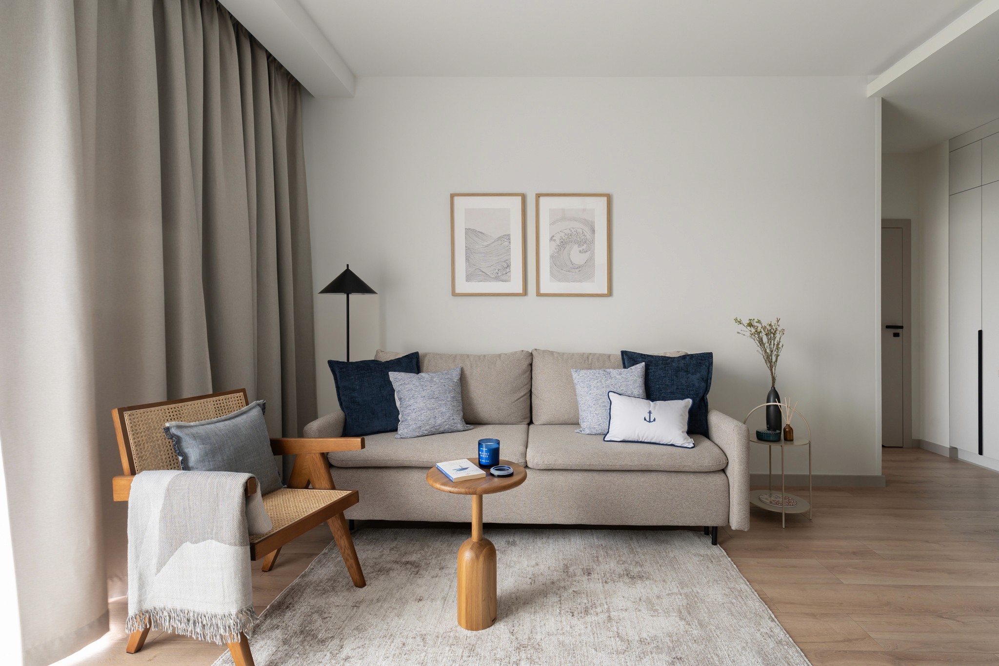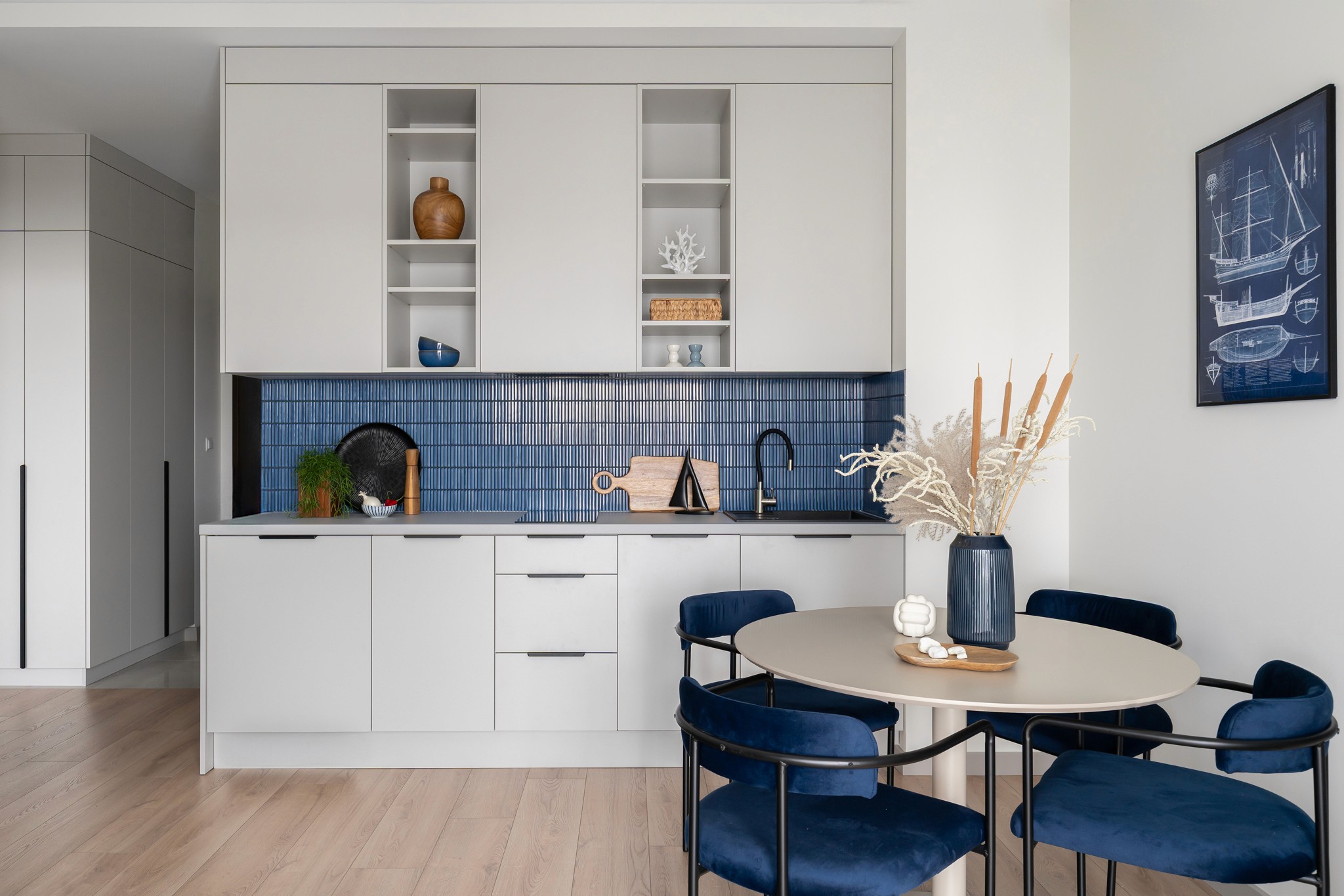Mieszkanie w gdańskiej Sol Marinie to projekt wyjątkowy – zarówno pod względem lokalizacji, jak i standardu. Położone nad Martwą Wisłą, w bezpośrednim sąsiedztwie Wyspy Sobieszewskiej, z przypisanym miejscem cumowniczym, już na starcie definiowało kierunek aranżacji. Wnętrze miało być nietuzinkowe, subtelnie marynistyczne i dające poczucie ukojenia – przestrzenią, do której chętnie wraca się po dniu spędzonym na wodzie.