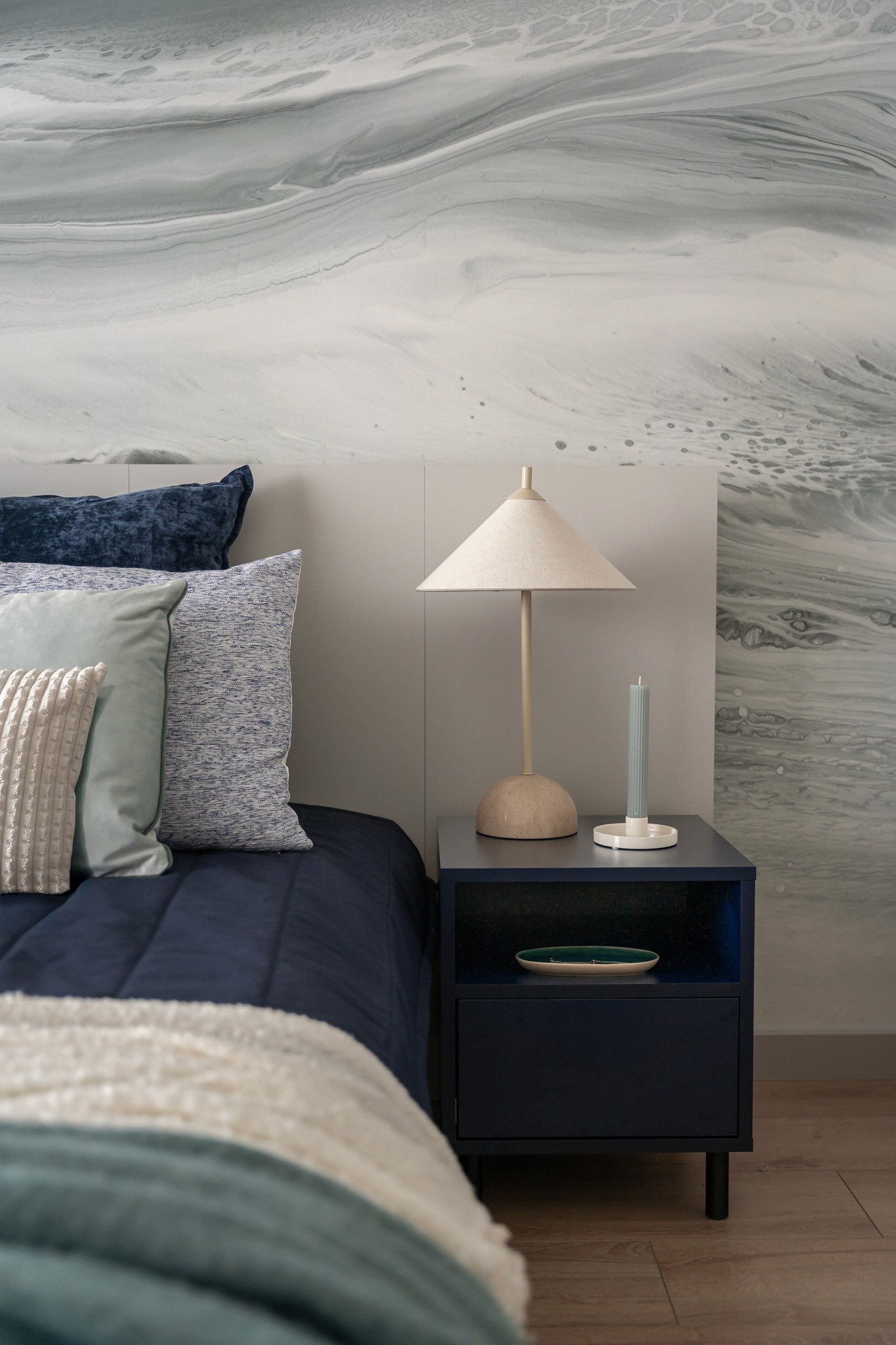 Styl wnętrza został pierwotnie określony przez architekta, a moim zadaniem było konsekwentne i eleganckie rozwinięcie tej wizji. Szczególnym wyzwaniem było kolorystyczne połączenie sypialni, w której dominują matowe odcienie turkusu, z resztą mieszkania – z granatowymi, połyskującymi płytkami w łazience i aneksie kuchennym.