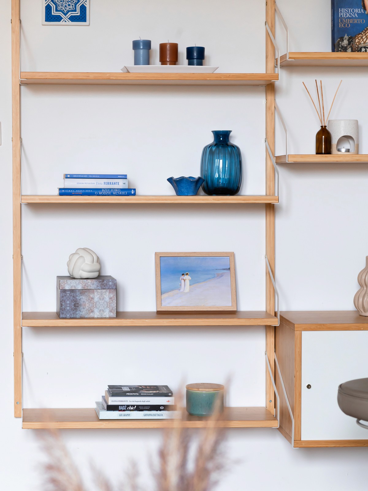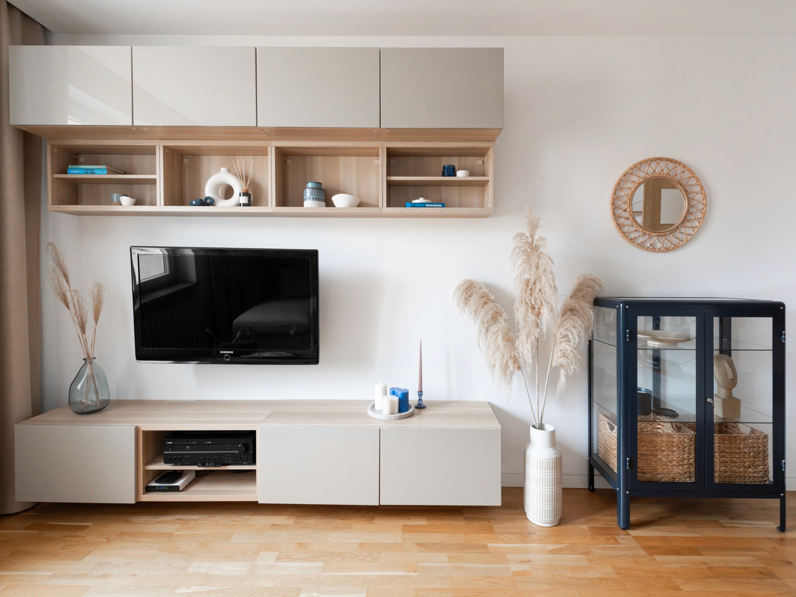 Salon przeszedł subtelną, ale znaczącą metamorfozę. Zniknęły elementy osobiste: zdjęcia, pamiątki, książki, rower oraz rośliny w słabszej kondycji. W ich miejsce pojawiły się spójne dodatki, grafiki oraz granatowa witryna z lustrem, która stała się mocnym akcentem kolorystycznym i nadała wnętrzu charakteru.