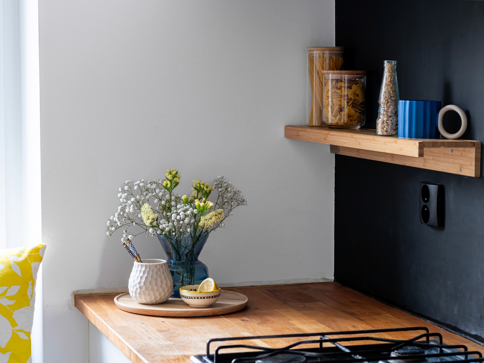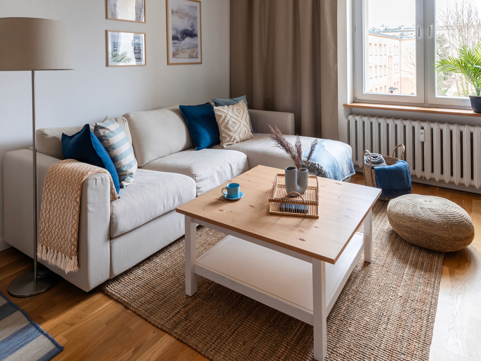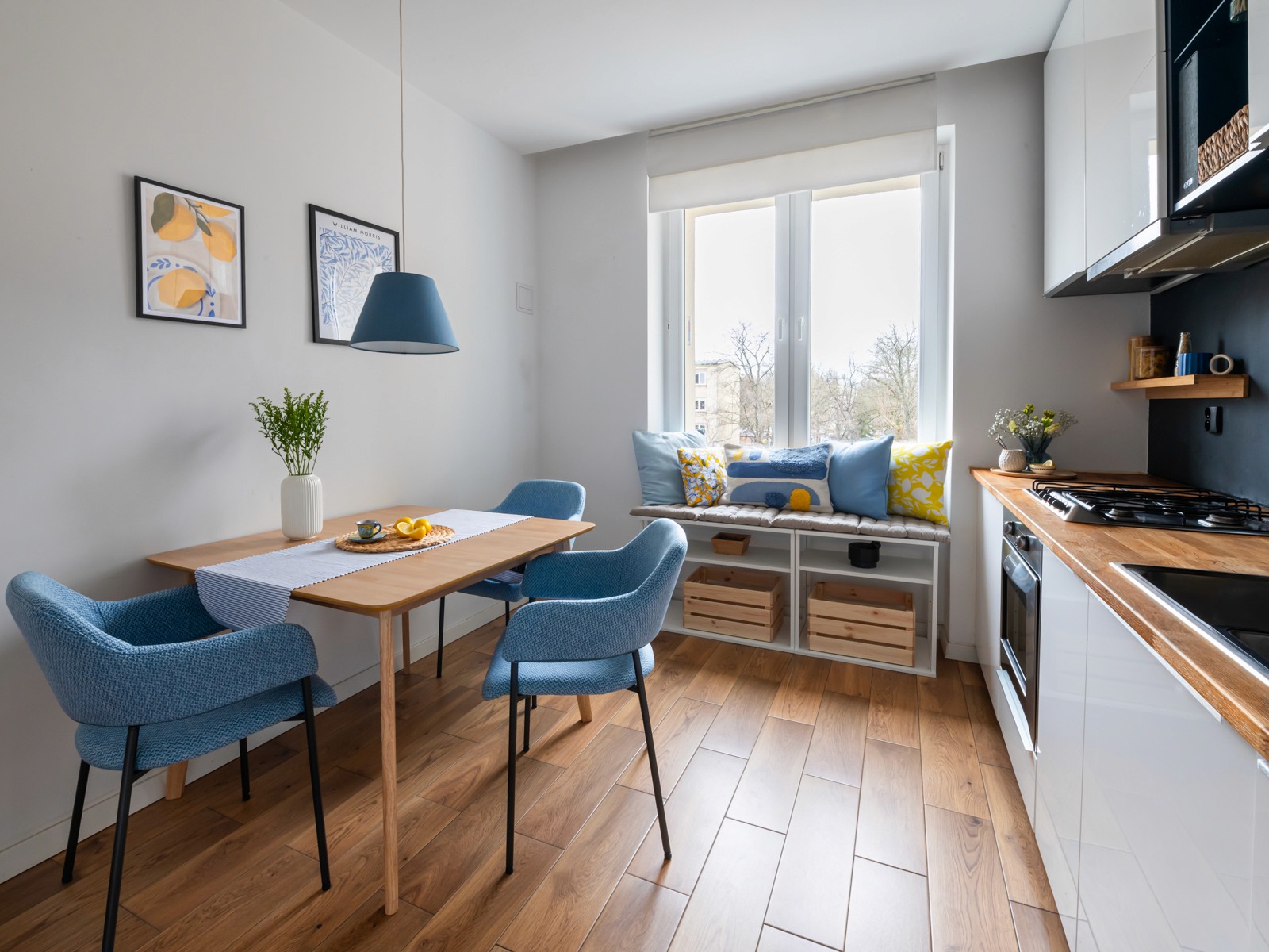 Kolorystyczną inspiracją stał się niebieski klosz lampy w kuchni – jedyny mocniejszy akcent w całym mieszkaniu. To od niego zaczęłam budować delikatną, ale konsekwentną linię kolorystyczną, która nadała przestrzeni charakter i świeżość, atrakcyjną dla młodej grupy docelowej.