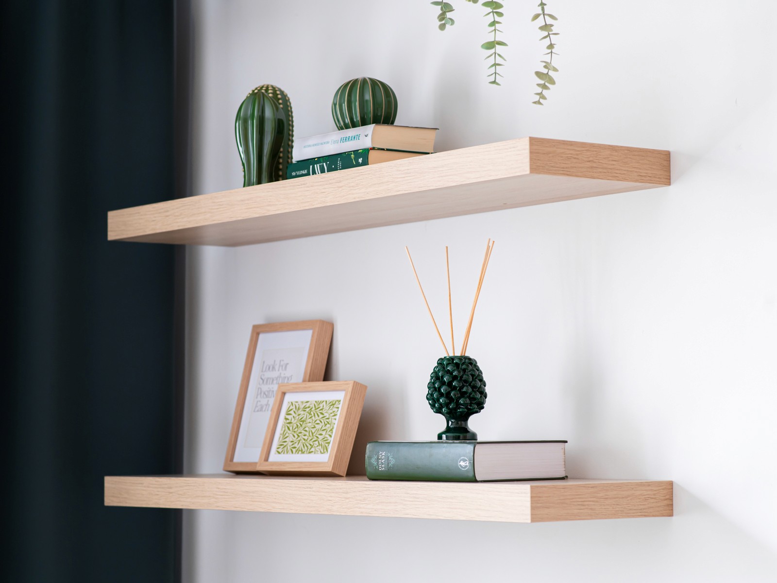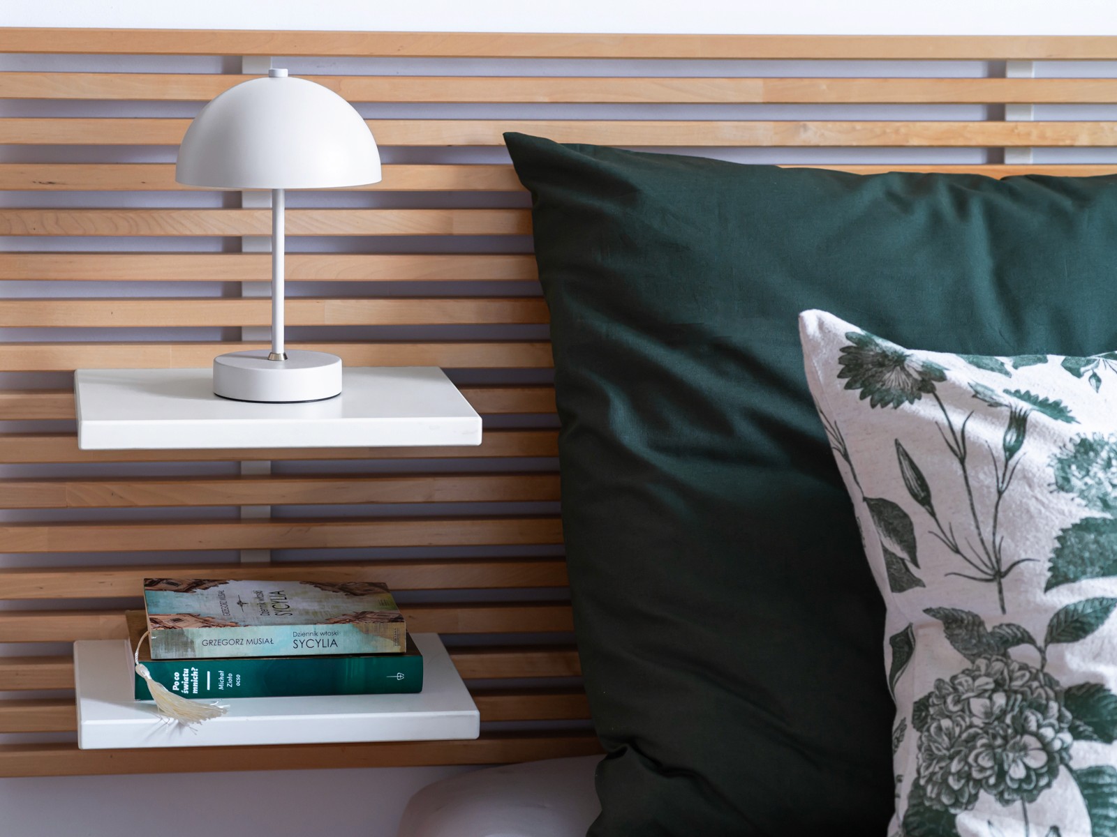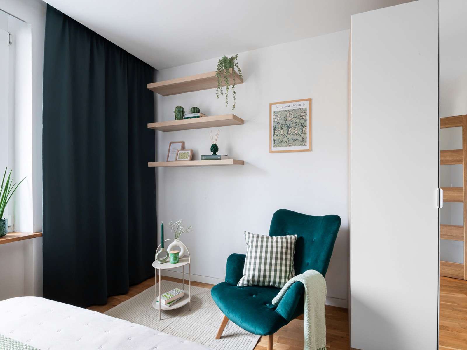 Dobrze dobrana narzuta i poduszki stały się kluczowym elementem stylizacji. Kolorystyka została dopasowana do zielonych zasłon, dzięki czemu wnętrze zyskało spójność i elegancki balans.